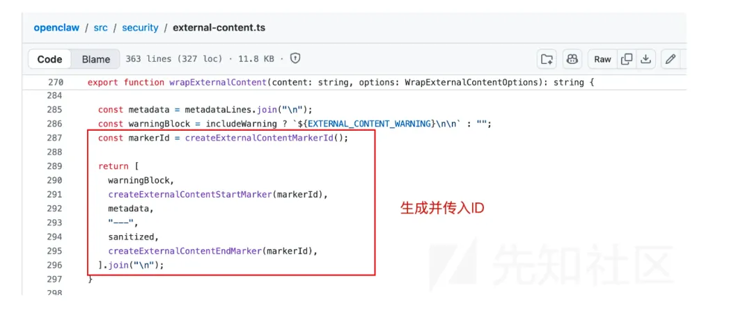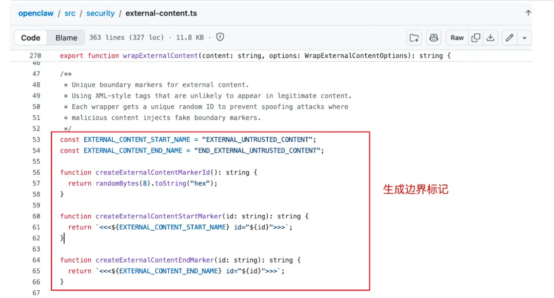这一层的核心是主要是上下文安全包装措施所在的地方,OpenClaw 会对外部网页内容追加 SECURITY NOTICE,同时使用随机 id 的边界标记包裹正文,并对可能伪造的边界标记做折叠和替换,具体执行的安全措施有如下5点。