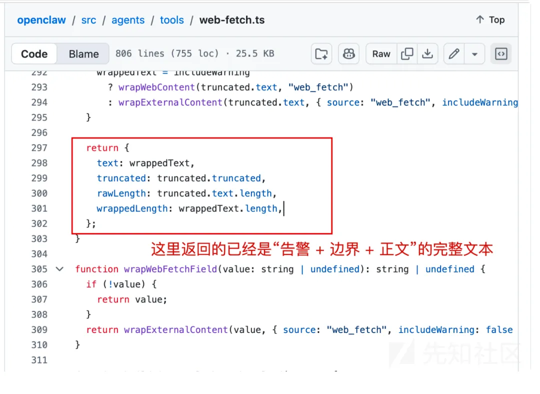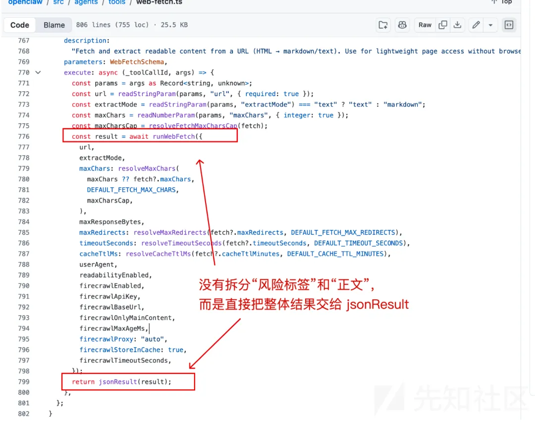 也就是说,离开 web_fetch 的不是“网页对象 + 风险状态”,而是一个已经文本化倾向很强的完整结果。