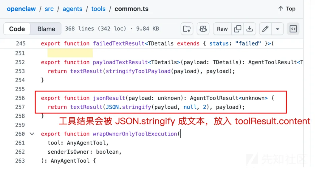 真正的关键断层出现在这里。jsonResult() 会把整个工具结果对象序列化成文本,并写入 toolResult.content。