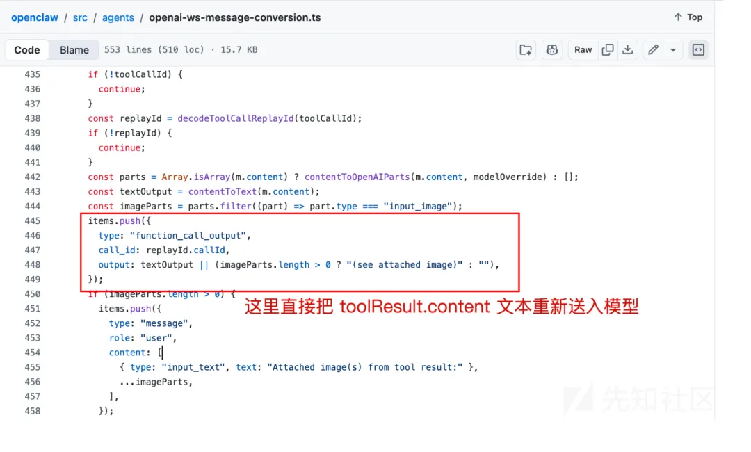 为了确认本次攻击并非单纯的“模型偶发失误”,而是OpenClaw在工具链设计上的一个可被利用的执行路径,我对openclaw源码进行了顺线分析。重点跟踪了web_fetch的返回内容如何进入模型上下文,以及模型产出的高风险工具调用最终如何被执行,从外部内容注入 -> 网页结果返回-> 工具结果文本化 -> 再次进入模型上下文 -> 高风险工具落地整个链路的代码逻辑进行分析。
