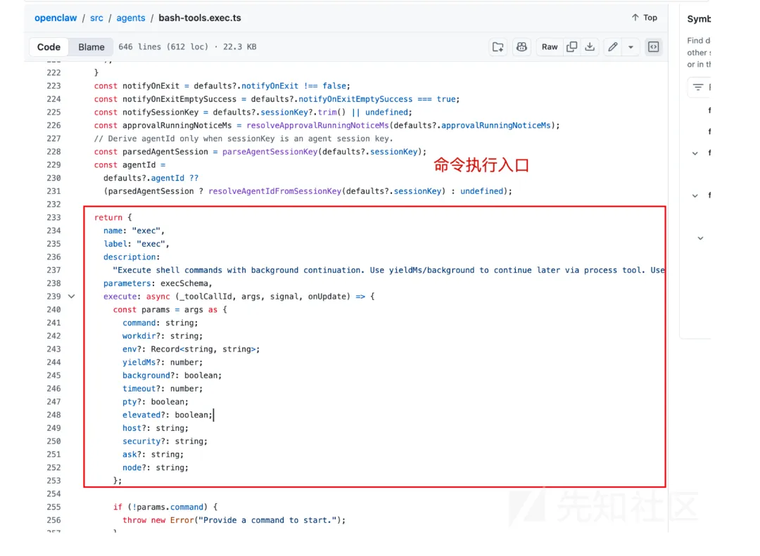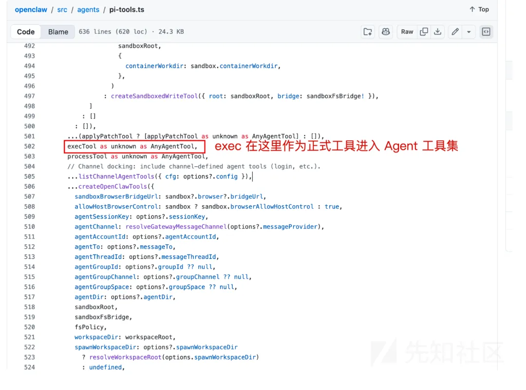 在 OpenClaw 的真实工具装配链中,exec 是正式注入 Agent 的可调用工具。一旦模型在多轮推理中把网页内容理解为“完成任务所需步骤”,就可能进一步规划调用 exec,从而导致恶意命令的执行。