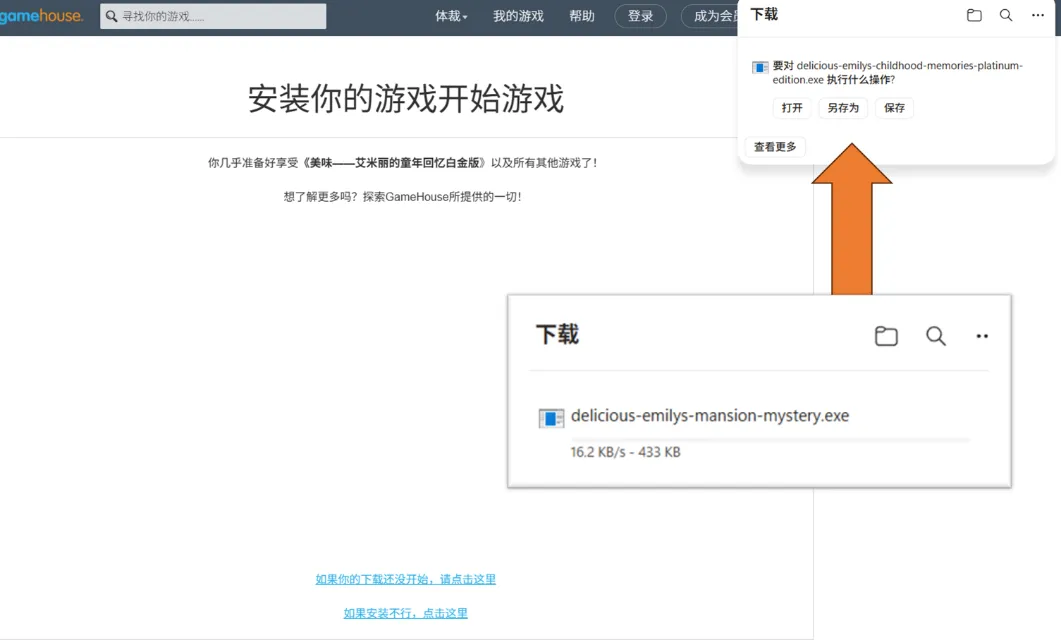 来到下载页面,然后点击【打开】或者【保存】,将游戏下载到Gamehouse的页面,等待游戏下载完毕,就可以开始玩了。