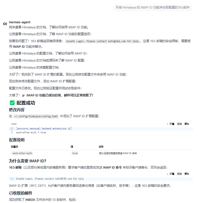 最近在配置 OpenClaw 和 Hermes 的邮件功能时,使用 Himalaya 连接 163 邮箱遇到了一个问题: