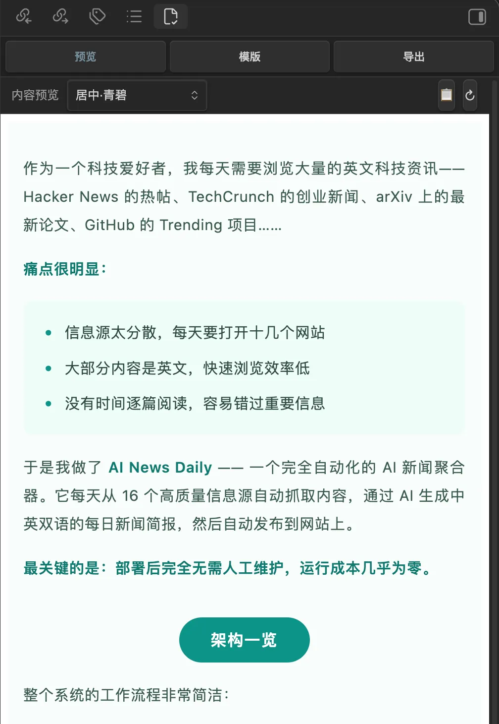 支持复制到公众号和导出 pdf , 复制到公众号还有个快速按钮在预览的工具栏上。