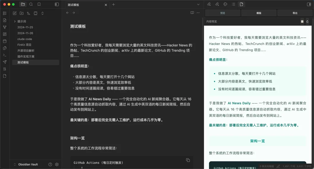 前几天做了一个obsidian公众号排版插件,昨天又更新了一版,解决了选择模板时不能看到即时预览效果问题。另外方便大家获取插件安装包,文末放了体验群二维码,进群获取。