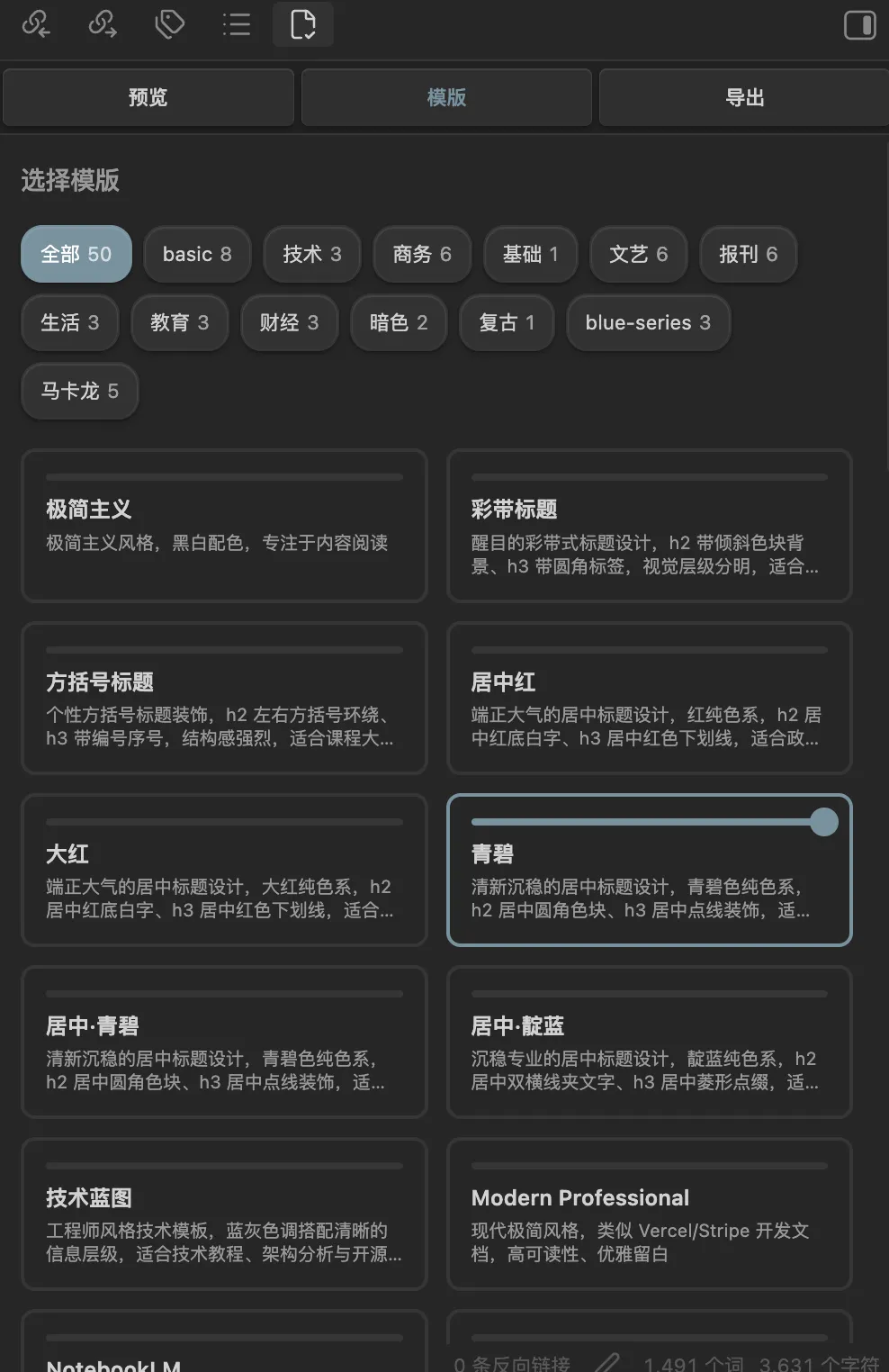 启用插件后的效果图。插件分三个 tab ,预览、模板、导出。