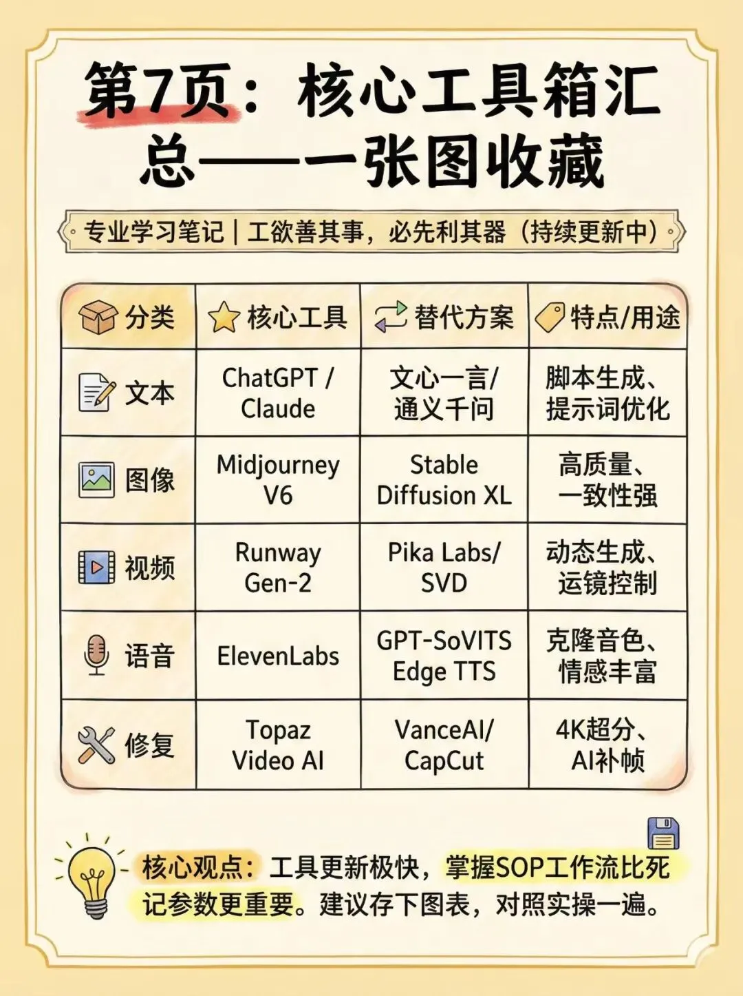 核心观点:工具更新极快,掌握SOP工作流比死记参数更重要。建议存下图表,对照实操一遍。