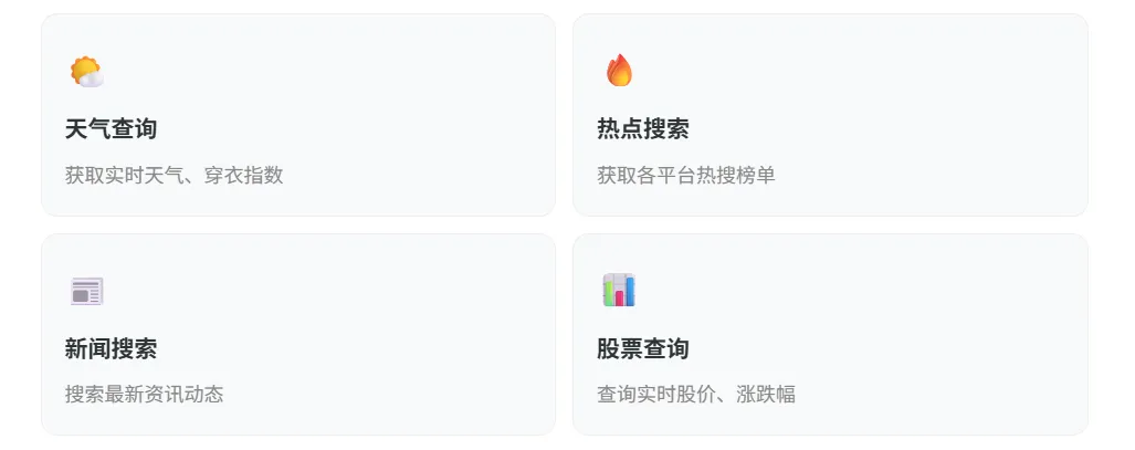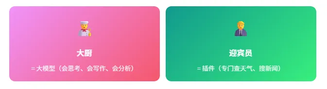 💡 关键点:插件让 AI 从”只会思考”变成”能动手干活”。大模型负责分析和输出,插件负责获取实时信息。