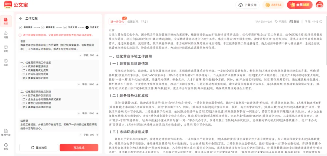 选择对应的专题后,它会引导你填写基本信息,然后自动生成符合专题要求的完整公文。还能根据你的身份、职务和发言场合,调整内容的侧重点和语气,生成的内容不用大幅修改就能直接使用。