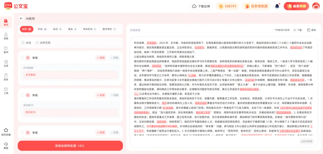 交材料前用一键校对功能,能自动找出错字、用词不当、语法错误等30多种问题,点击采纳就能替换原文,省心又省力。
