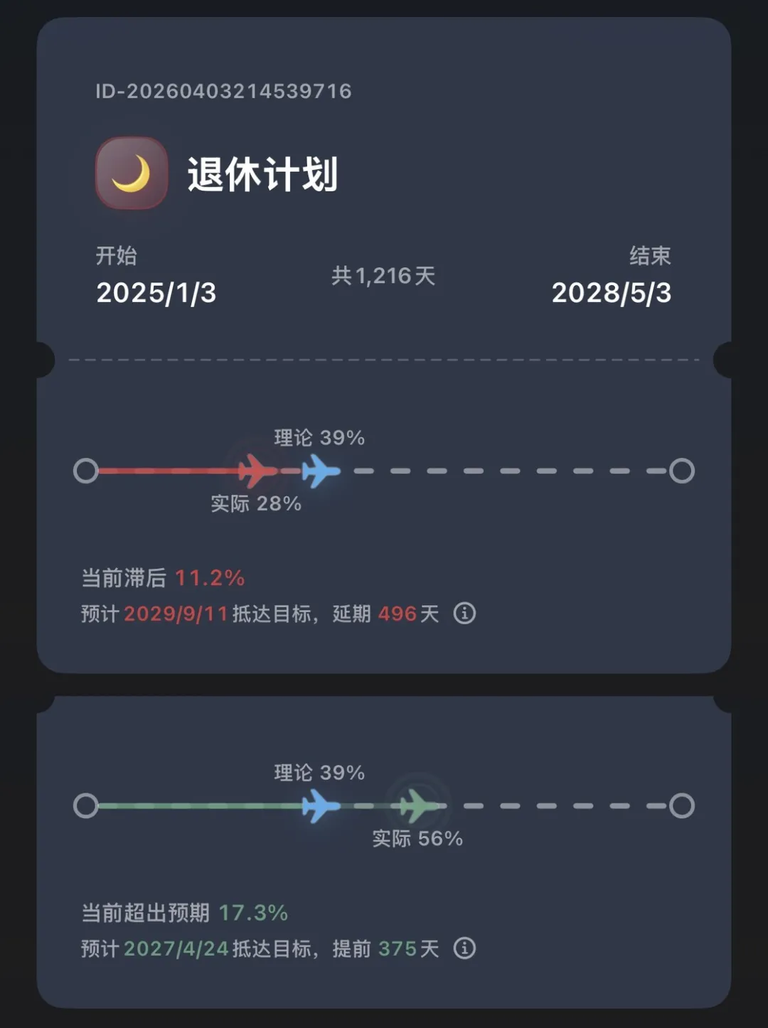 是对进度的不确定性。我突然意识到,进度差这么多并不是这个周末导致的,其实从很早的一天就开始止步不前了,但由于但是时间还早会以为起步慢是正常的,但终于到了三分之一的时间或者二分之一的时间,才突然意识到当前的进度远远不够。当更多的事情开始叠buff后,延期成为妥协的办法,默默的把退休目标的时间向后推迟。但也许当前的进度是应该能被清晰的感知的,而不是真正偏离了太多后的不得不妥协。