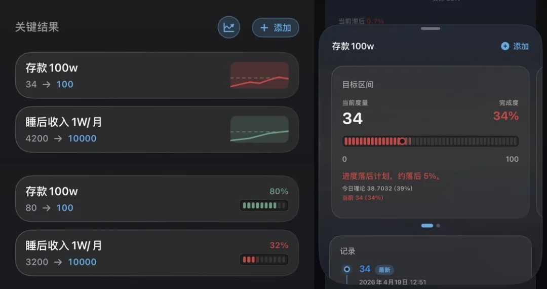 首先它是一款OKR App,这里不详细赘述OKR的理念,为了不让大家抵触名词我们把它理解为目标就好。在抵达目的地这条路是宽泛的,需要通过拆解来进行量化进度。app的核心功能之一就是清晰的预测:从时间的维度,来推断当前的理论进度,对比当前的实际进度,来提醒你当前是落后了还会超前。并根据最近的记录增加速度来推断预计完成(抵达目的地)时间: