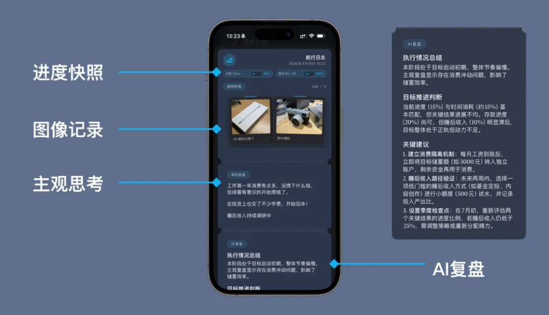 在目标持续推进的过程中,复盘是不可或缺的一环。只有定期回顾与反思,才能及时校准方向,避免在偏差中不断累积。你可以主动发起复盘,记录当下的主观思考与阶段感受。在 AI 的辅助下,系统会结合你的复盘内容与整体进度,输出执行总结,并提供更客观、可落地的优化建议。