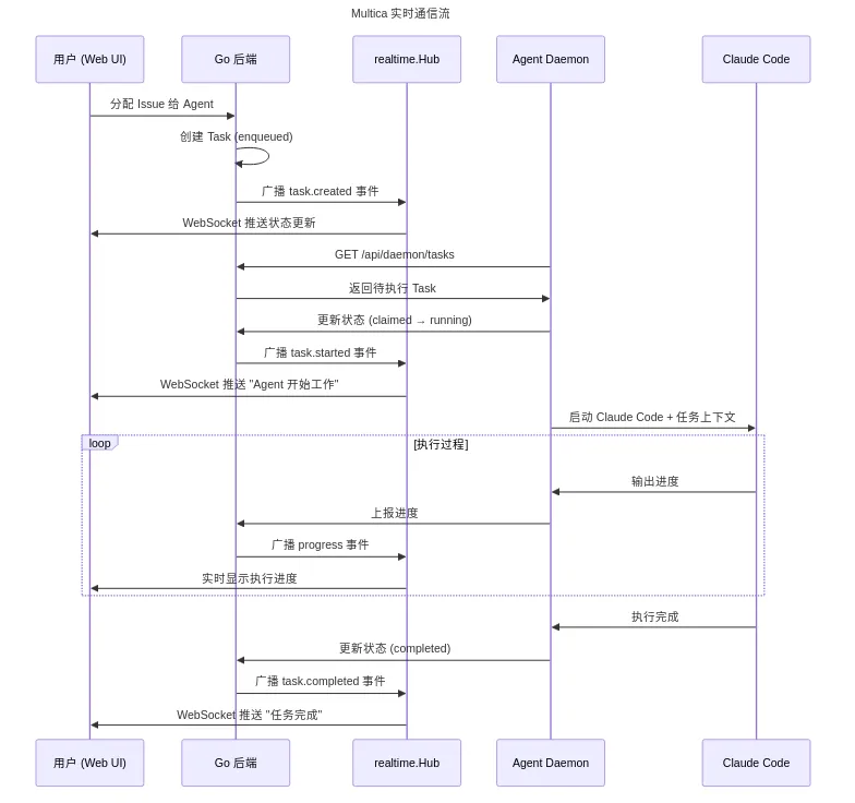 后端的核心是 realtime.Hub——一个 WebSocket 广播中心。所有状态变更(任务创建、Agent 认领、进度更新、完成/失败)都通过 Hub 广播给所有连接的客户端。这是 Multica 实时性的基础。