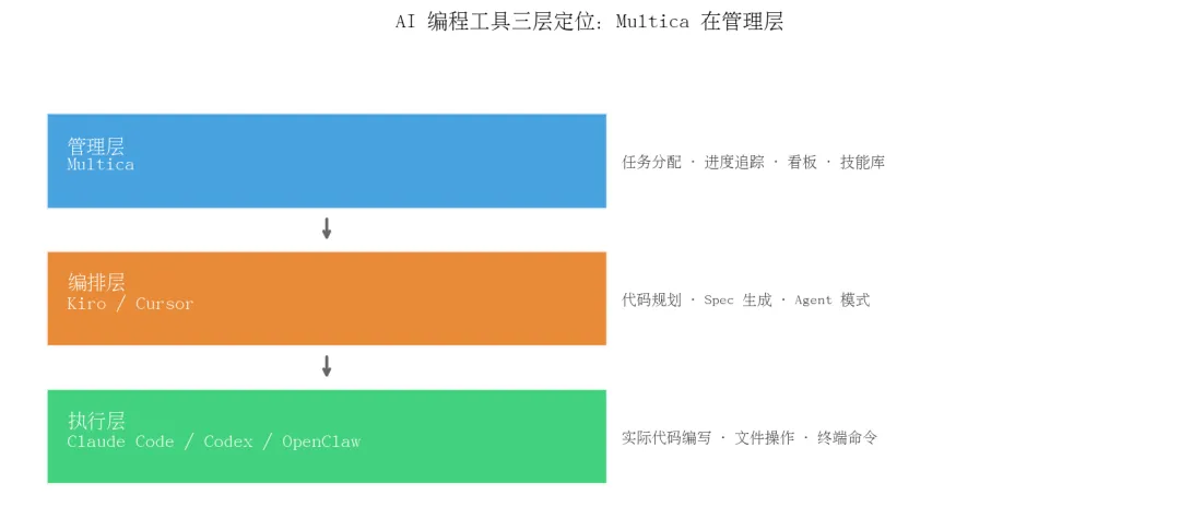 分层对比图:三个水平层级,顶层管理层Multica(蓝色)负责任务分配和进度追踪,中层编排层Kiro/Cursor(橙色)负责代码规划和Agent模式,底层执行层Claude Code/Codex/OpenClaw(绿色)负责实际代码编写,层间有向下箭头表示调用关系