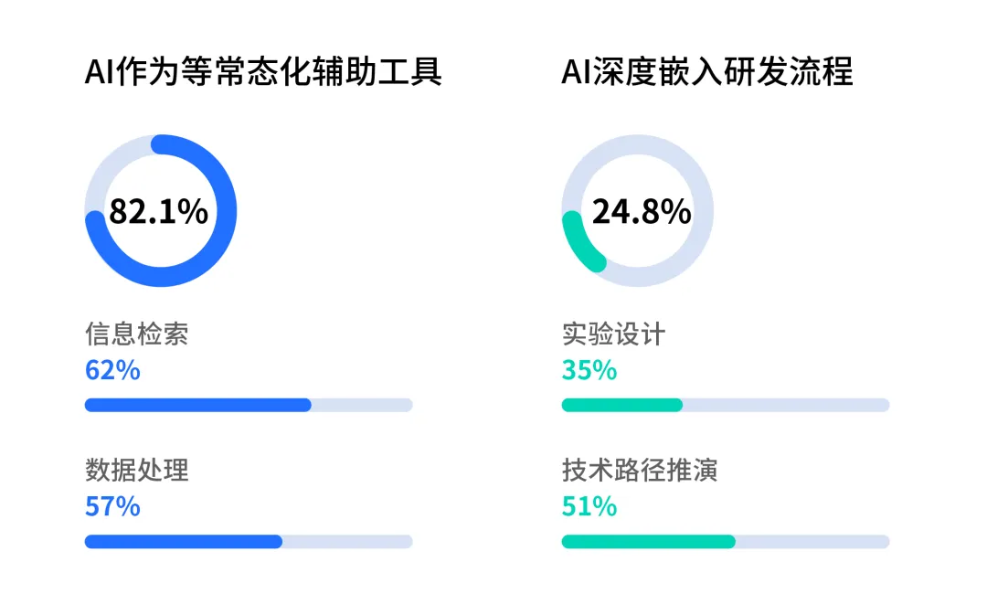 调研显示,AI已深度融入工作日常:82.1%的用户将AI作为信息检索、数据处理等常态化辅助工具,更有24.8%的用户将AI深度嵌入研发流程,在实验设计、技术路径推演中发挥核心作用。