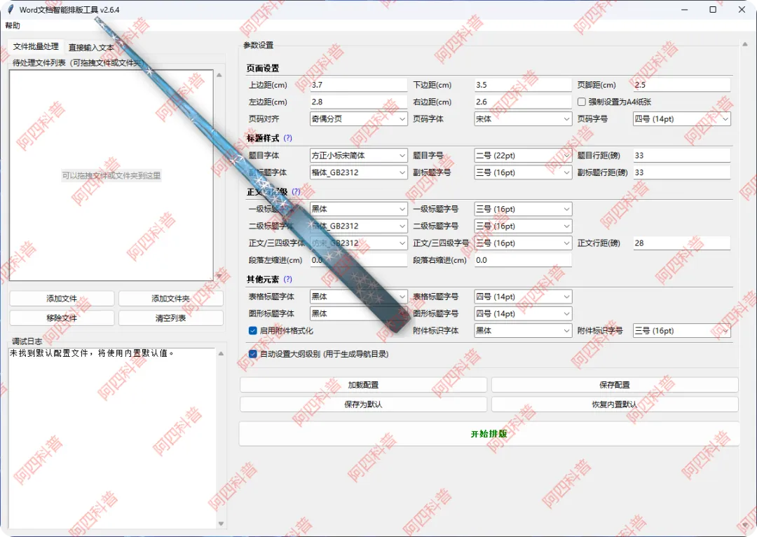 操作也特别简单,添加文件、简单设置参数,点击开始排版,选择输出文件夹,就能生成格式规范的新文档,还不会改动你的原文件。