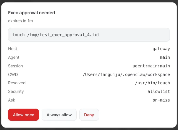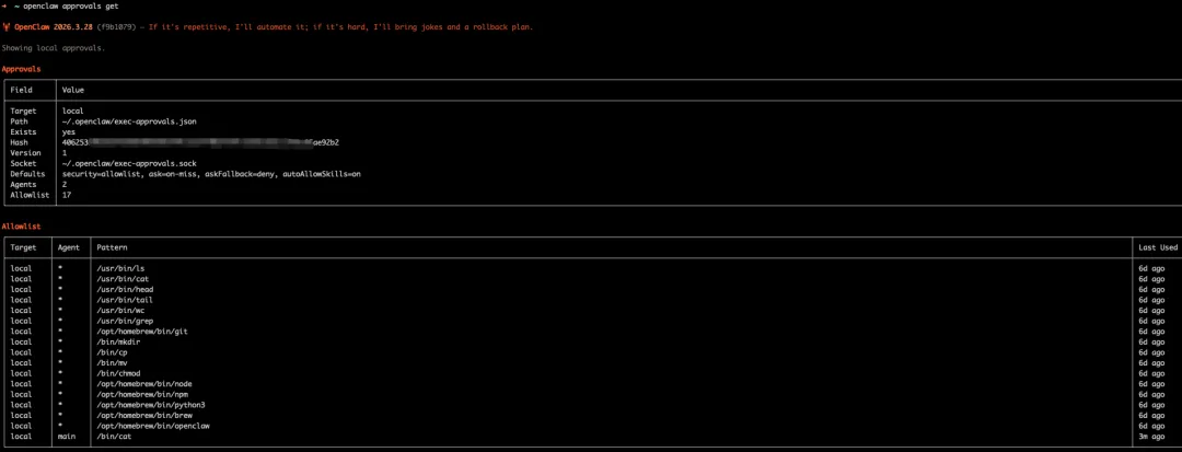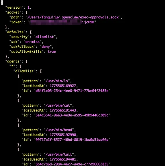 {// ═══════════════════════════════════════════════════════════// Gateway — 网关服务配置// ═══════════════════════════════════════════════════════════"gateway": {"port": 18987, // 监听端口"mode": "local", // 运行模式: local 表示仅允许本地访问"bind": "loopback", // 绑定地址: loopback 仅监听 127.0.0.1,拒绝外部直连// 认证配置"auth": {"mode": "token", // 认证方式: token"token": { "source": "env", "provider": "default", "id": "OPENCLAW_GATEWAY_TOKEN" },"rateLimit": { // 在 windowMs 毫秒内失败 maxAttempts 次后,锁定 lockoutMs 毫秒。"maxAttempts": 5, // 认证失败上限"windowMs": 60000, // 计数窗口: 60 秒"lockoutMs": 300000, // 超限后锁定: 5 分钟"exemptLoopback": true // 回环地址免限速(本机管理用)}},"trustedProxies": ["127.0.0.1", "::1"], // 受信任的反向代理 IP 列表(用于解析 X-Forwarded-For)"allowRealIpFallback": false, // 禁止回退到 socket IP,防止 IP 伪造// 控制台 UI"controlUi": {"enabled": true, // 启用 Web 管理界面"allowedOrigins": [ "http://127.0.0.1:18987" ], //非 loopback 浏览器访问时(http://localhost:18987),必须显式允许来源。"allowInsecureAuth": false, // 禁止 HTTP 明文认证(必须 HTTPS 或 loopback)"dangerouslyDisableDeviceAuth": false // 保留设备认证},// TLS 配置(当前 loopback 模式不需要)"tls": {"enabled": false,"autoGenerate": false},// Tailscale 集成(关闭)"tailscale": {"mode": "off","resetOnExit": false},// HTTP API 端点配置"http": {"endpoints": {// OpenAI 兼容的 Chat Completions 接口,第三方应用通过 OpenAI 兼容 API 调用你的 OpenClaw"chatCompletions": {"enabled": true,"maxBodyBytes": 20971520, // 请求体上限: 20MB"maxImageParts": 8, // 单次请求最多 8 张图片"images": {"allowUrl": true, // 允许通过 URL 引用图片"allowedMimes": ["image/jpeg", "image/png", "image/webp"],"maxBytes": 10485760, // 单张图片上限: 10MB"maxRedirects": 3, // URL 图片最大重定向次数"timeoutMs": 10000 // URL 图片下载超时: 10 秒}},// Responses API 端点"responses": {"enabled": true, // 启用 /v1/responses API"maxBodyBytes": 20971520 // 响应体上限: 20MB}}// 只有在 OpenClaw Gateway 自己直接暴露 HTTPS 时,才会配置 strictTransportSecurity。(gateway.tls.enabled: true)// 建议在反向代理上终止 TLS,并把 HSTS 配到代理上。//"securityHeaders": {// "strictTransportSecurity": "max-age=31536000; includeSubDomains" // HSTS 头配置//}},// Gateway 层工具黑名单,禁止通过 HTTP API 调用这些工具。应该通过 Agent 调用。"tools": {"deny": ["gateway", "cron", "nodes", "browser", "canvas"]},// 节点命令 /node 黑名单,禁止摄像头和录屏。"nodes": {"denyCommands": ["camera.snap", "camera.clip", "screen.record"]},// 配置热重载"reload": {"mode": "hybrid", // hybrid: 文件监听 + 信号触发"debounceMs": 300 // 防抖: 300ms 内多次变更只重载一次},"channelHealthCheckMinutes": 5 // 渠道健康检查间隔: 5 分钟},// ═══════════════════════════════════════════════════════════// Discovery — 服务发现(关闭 mDNS 防止局域网暴露)// ═══════════════════════════════════════════════════════════"discovery": {"mdns": {"mode": "off"}},// ═══════════════════════════════════════════════════════════// Browser — 浏览器工具(完全禁用)// ═══════════════════════════════════════════════════════════"browser": {"enabled": false, // 禁止 Gateway 在主机中使用浏览器工具。应该通过 Agent 在沙箱中使用。"evaluateEnabled": false, // 禁止浏览器执行网页上下文中的 JS 代码,防止 XSS 攻击。"ssrfPolicy": {"dangerouslyAllowPrivateNetwork": false // 禁止浏览器访问内网地址,防止 SSRF 攻击。}},// ═══════════════════════════════════════════════════════════// Secrets — 密钥提供者配置// ═══════════════════════════════════════════════════════════"secrets": {"providers": {"default": {"source": "env" // 从环境变量读取密钥(配合 ~/.openclaw/.env)}}},// ═══════════════════════════════════════════════════════════// Auth — 模型认证配置// ═══════════════════════════════════════════════════════════"auth": {"profiles": {"zai:default": { // 智谱 AI 默认认证配置"provider": "zai","mode": "api_key"}},// 当 LLM API 返回 429 Too Many Requests(限流)、402 Payment Required(账单问题)、503 Service Unavailable(服务不可用)等问题后,会自动暂停调用该提供者。"cooldowns": {"billingBackoffHours": 1, // 账单错误初始退避: 1 小时"billingMaxHours": 12, // 账单错误最大退避: 12 小时"failureWindowHours": 6 // 失败计数窗口: 6 小时}},// ══════════════════════════════════════════════════