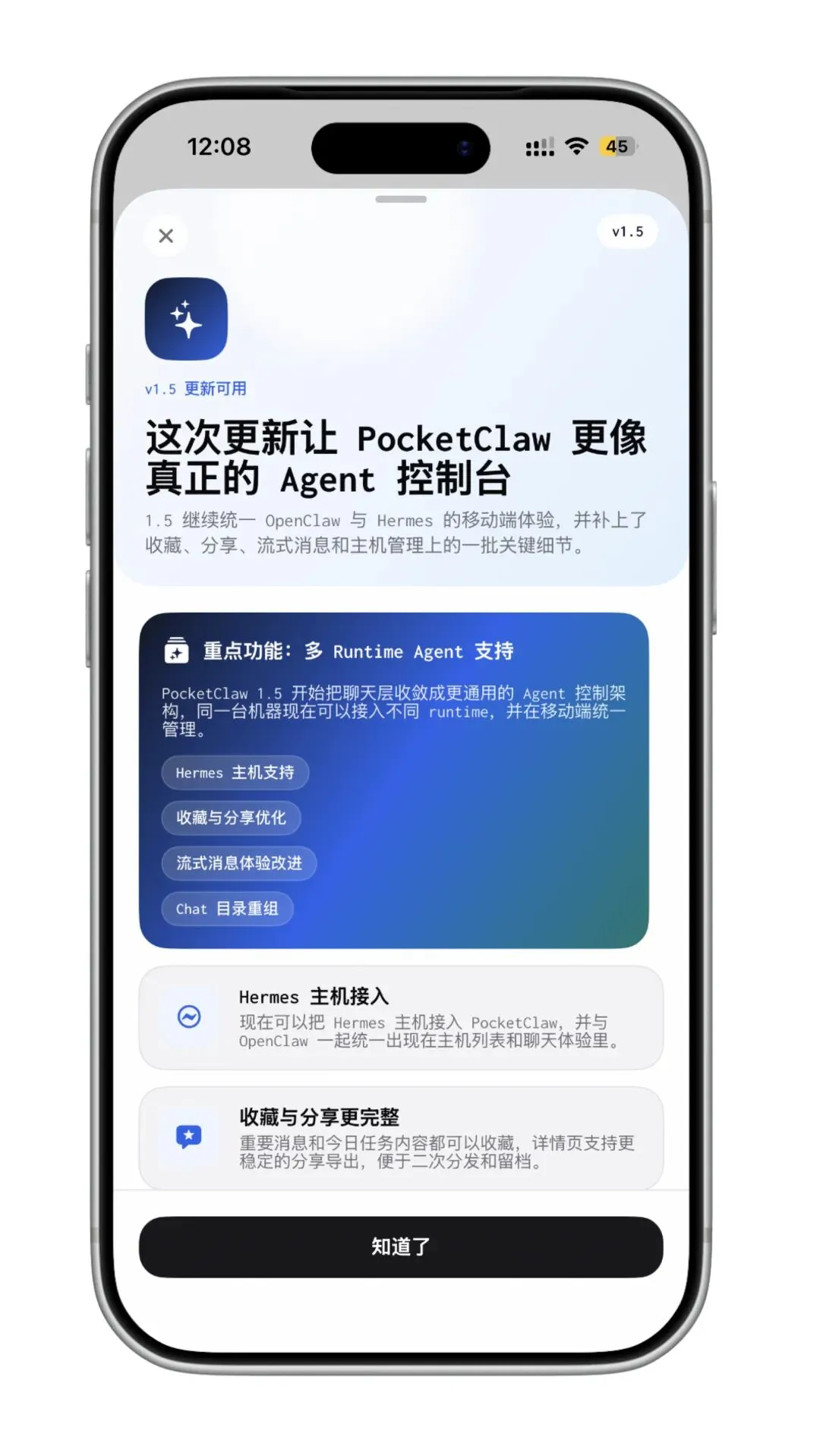 我在手机上用 OpenClaw 处理即时性任务(查数据、发消息、跑命令),用 Hermes 处理需要持续跟进的项目(每日摘要、周期性分析)。两个 Agent 在 PocketClaw 里切换很方便,不用退出重新登录。