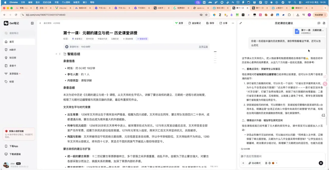 比如上传到Get笔记,再利用Get笔记来评课(AI评课)。“假如你是一名经验丰富的历史教研员,请你帮我看看这节课还可以怎么优化。”