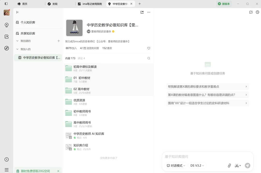 打开IMA知识库,我们可以建立我们的个人知识库,把教材、教参、教辅、论文等相关资料的电子版上传到知识库里。也可以加入其他老师的共享知识库。