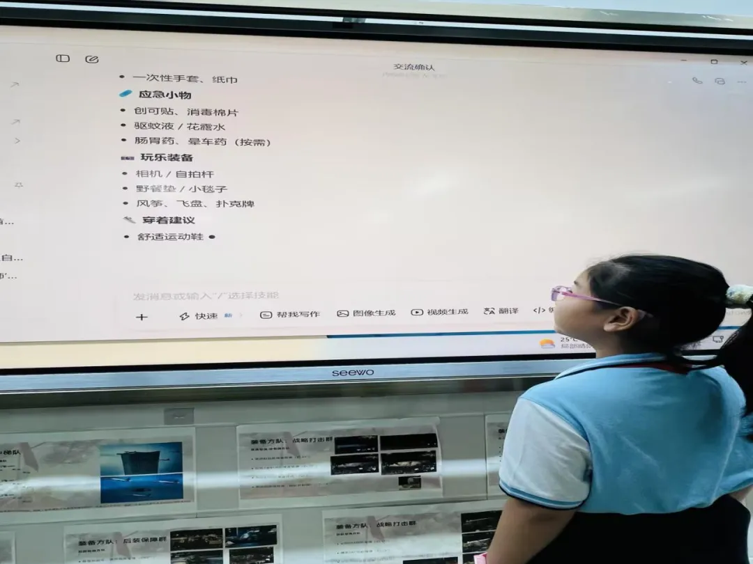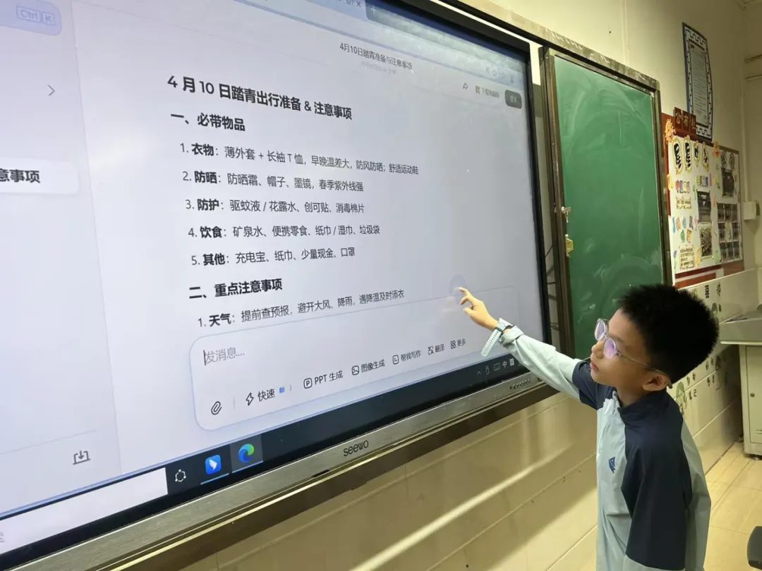 活动筹备阶段,各班以小组为单位,在老师指导下使用 AI 工具开展出行规划。同学们主动向 AI 咨询春日目的地特色、当日天气情况、安全出行注意事项与舒适穿搭建议,还借助 AI 量身设计适合四年级学生的户外探索小任务,共同整理出清晰实用的春游物品清单。通过自主提问、互动查询、分工整理,大家提前做好充分准备,带着明确目标与满满期待,为本次春日实践活动打下良好基础。