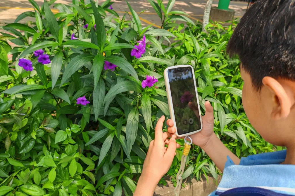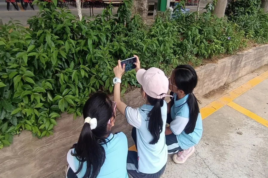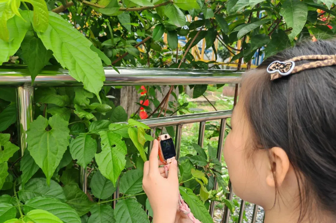 踏青行进过程中,同学们化身小小自然博物官,积极运用 AI 识物 APP、电话手表拍照识物等功能,对沿途遇见的花草、树木进行实时识别。大家认真聆听 AI 讲解的科普知识,仔细观察植物形态,轮流记录关键信息到春日探索手册中。原本陌生的自然万物,在AI工具帮助下变得生动易懂,同学们主动观察、主动提问、主动记录,在行走的课堂中拓宽视野,真切感受春日大自然的神奇与美好。
