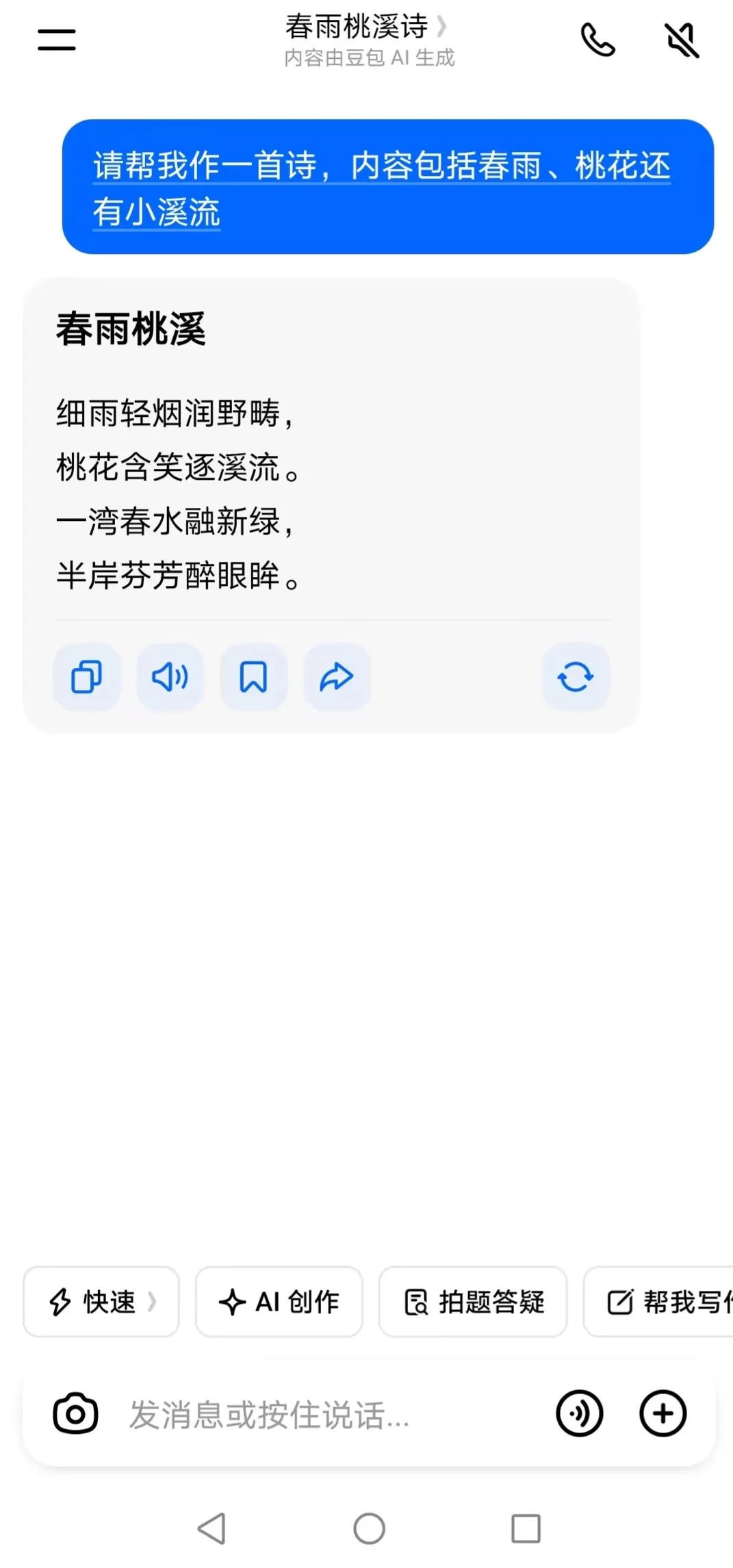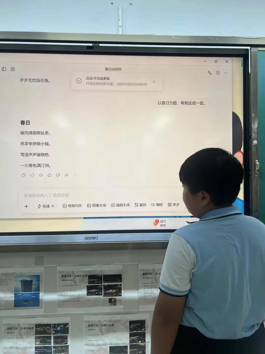 踏青返程后,同学们进入创意总结阶段,借助 AI 工具将春日美好转化为专属作品。大家使用 AI 创作工具,以春游所见的桃花、草地、阳光、春风等为关键词,生成一幅幅充满童趣的春日主题画作;还通过 AI 输入主题,创作以春游、自然、春光为内容的小诗。最后全班共同展示诗、画作品,交流活动感受,把短暂的踏青体验 ,升华为可留存、可分享的创意成果。