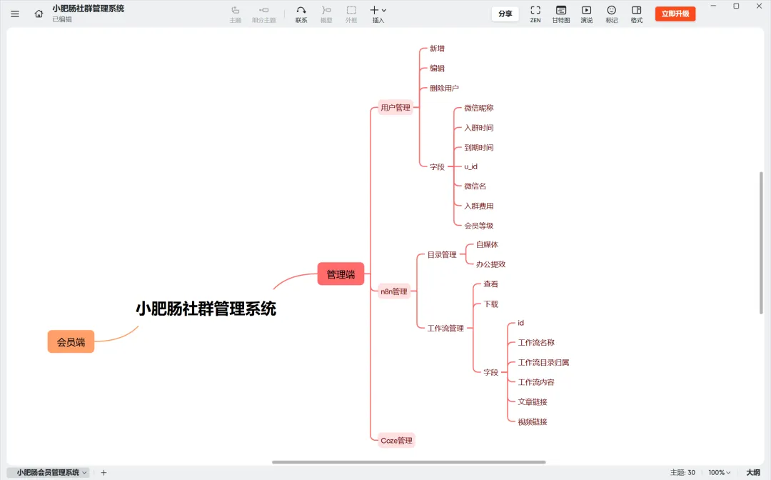 做系统首先是拉功能模块,我比较习惯用思维导图,大家梳理功能模块的时间也强推思维导图,逻辑会越来越清晰,下面不是终版的功能模块,是中间产物,终版的找不到了….功能模块如何罗列这个我会在以后另写写一篇文章来详尽描述。