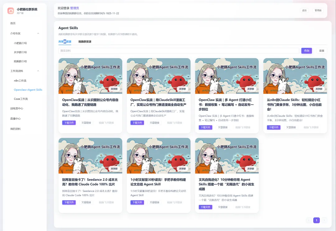 这个系统的核心就是把我之前做的工作流,skill、直播教学、训练营资料做集中归纳,之前这些资料都是放在飞书,四处分散,大家反馈找资料费劲。我也意识到了这一点,于是就花了一个月跟Codebuddy完成了这个系统。 有一说一这个系统在AI工具的加持下开发周期也就一周,主要是我平时精力太分散(一人公司大家懂的),于是断断续续弄了一个月才上线。