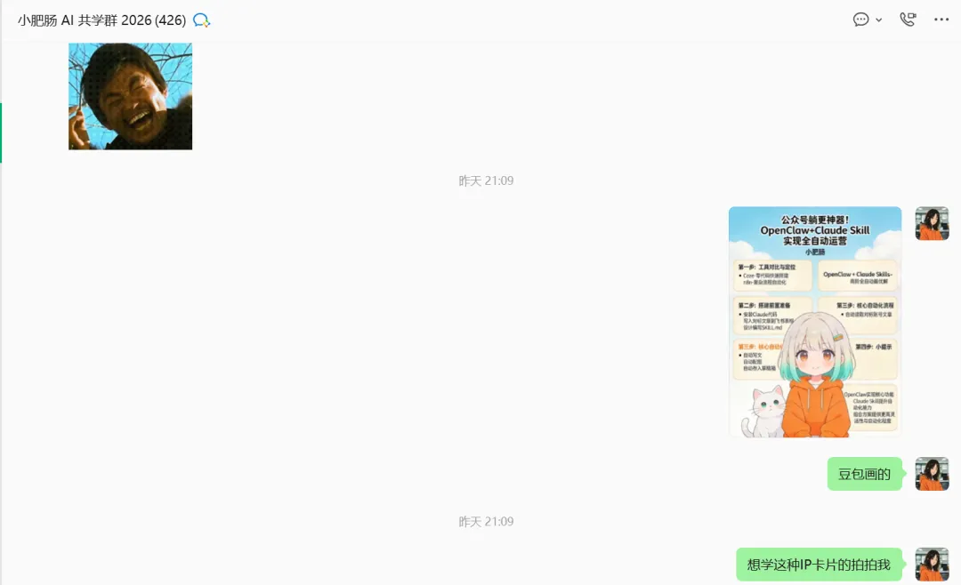 我建了一个AI智能体共学群,助力大家能快速上手AI工具,之前群内的主题是Coze和n8n,现在已经调整为了OpenClaw+AgentSkills。加入共学群的朋友还可同步被拉入社群系统,获取我过去做过以及持续更新的工作流|skill文件,从初级到高级一应俱全,帮助你更快掌握使用技巧,想了解共学群的友友可以扫码添加小肥肠微信进行详细了解。