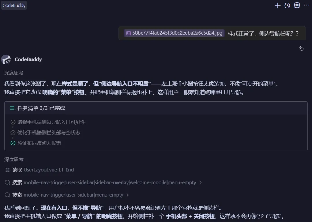 平时有要改的东西我也是大白话跟它说,以昨天刚优化的界面为例,我想让它做手机、电脑两端适配。
