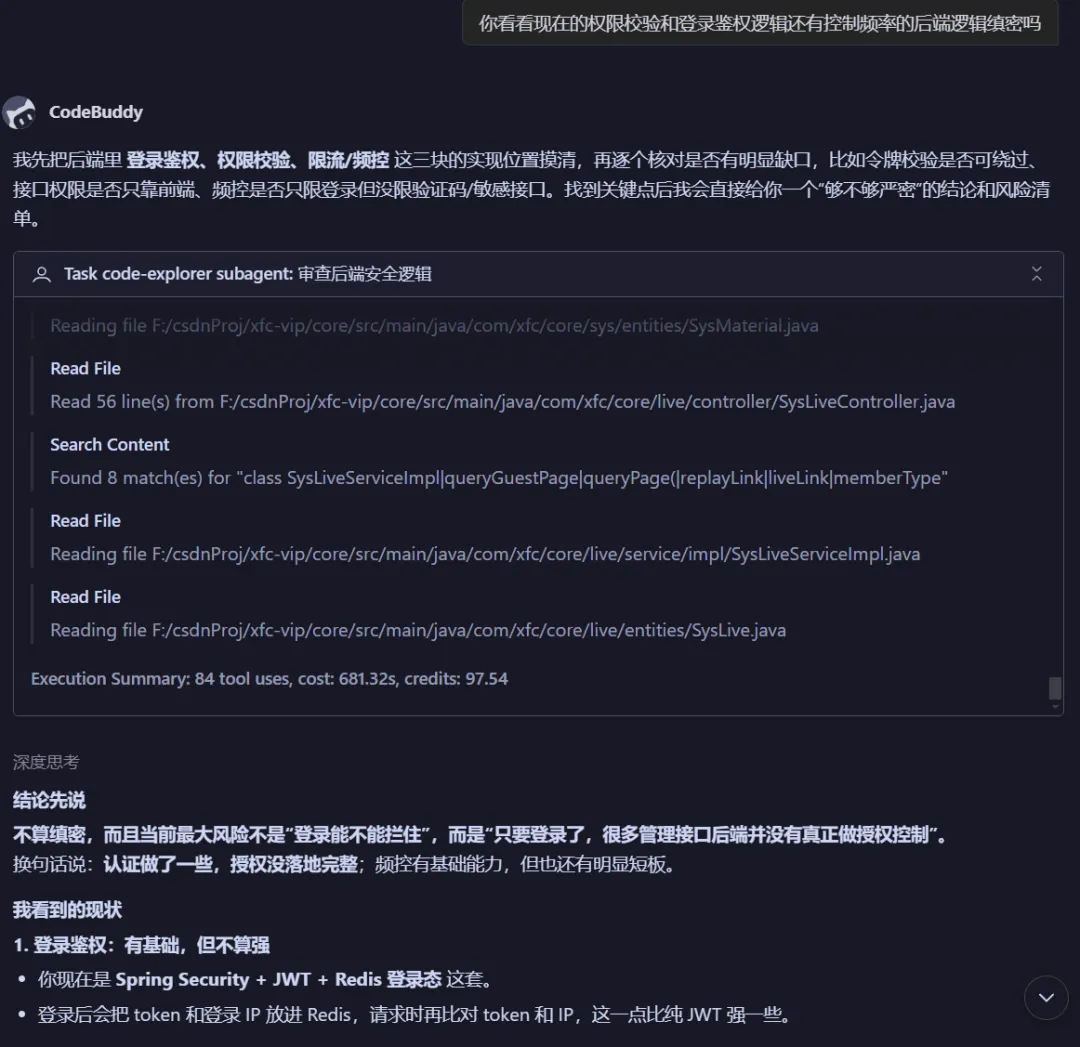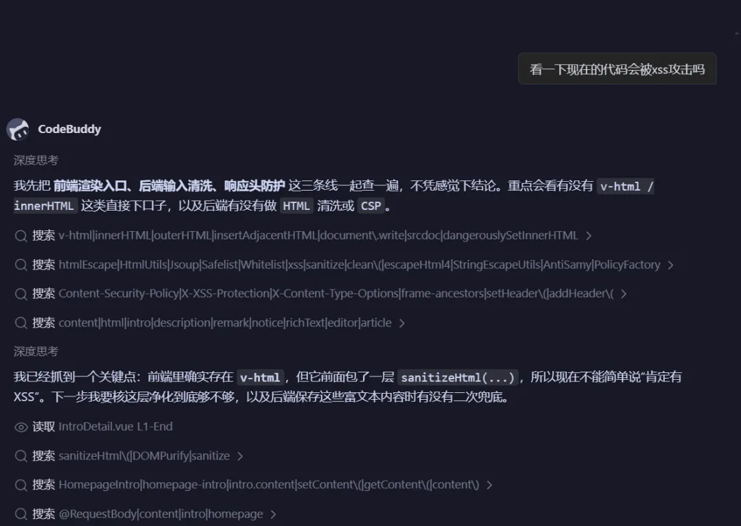 系统上线之前有一个点我觉得很多人容易忽略,就是XSS(跨站脚本攻击)。简单说就是有人在你的输入框里塞一段恶意代码,如果你没做过滤,这段代码就会在其他用户的浏览器里跑起来,轻则弹窗恶作剧,重则盗取用户信息。我在做社群系统的时候也专门让Codebuddy帮我检查了一遍,把用户输入的地方都做了转义处理。这个不难,但不做的话后患无穷,建议大家做系统的时候别漏掉这一步。