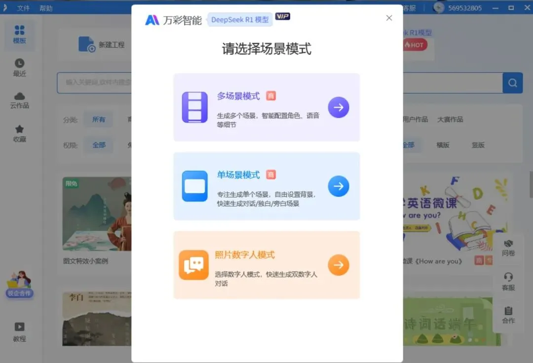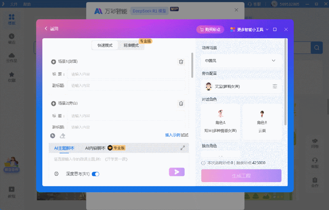 还有AI动态角色和AI生场景图也超实用!做微课的时候总担心画面单调?添个动态角色进去,讲课的时候角色会有自然的动作和表情,瞬间让内容更有吸引力。需要特定场景的图片不用再到处找素材,输入关键词,AI就能生成符合需求的场景图,风格还能自己选,古风、现代、卡通风都能搞定,素材库直接“开挂”。
