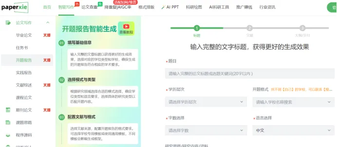 本科开题报告一站式解决方案,模块化输入、高效产出规范文本。输入题目、关键词、学历层次,选择模板,配置文献,快速输出 6000 字以上完整开题报告。