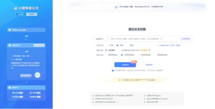 小微智能论文,是一款由小微科技推出的AI智能论文学术写作辅助工具,专注于帮助用户简化学术写作过程,提高写作效率,同时确保论文的质量和学术规范。