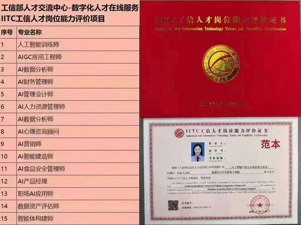 经测评合格者,由工业和信息化部人才交流中心颁发《AI产品经理》IITC工信人才岗位能力评价证书,并可在工业和信息化部人才交流中心官网查询验证(查询和下载网址:https://ai.miitec.cn/)。