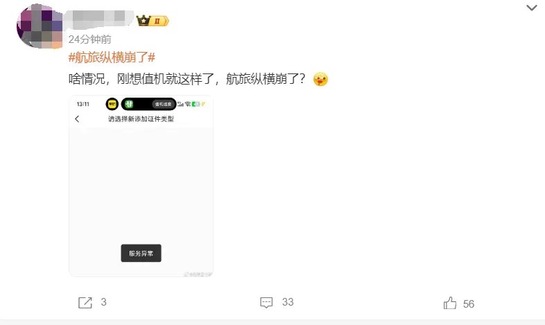 “航旅纵横崩了”登上热搜,App突发服务异常,大量用户打不开行程、买不了票,显示“网络异常”“服务不可用”,官博回应:已反馈核实 4 月 21 日,航旅纵横 App 突发服务异常,大量用户打不开行程、买不了票,显示 “网络异常 / 服务不可用”,相关话题#航旅纵横崩了#登上热搜。 对此,@航旅纵横 官博在评论区回应称,“十分抱歉,小横已反馈核实中,辛苦耐心等待一下,感谢您的理解与支持!” 来源:@航旅纵横、白鹿视频、荆楚网
