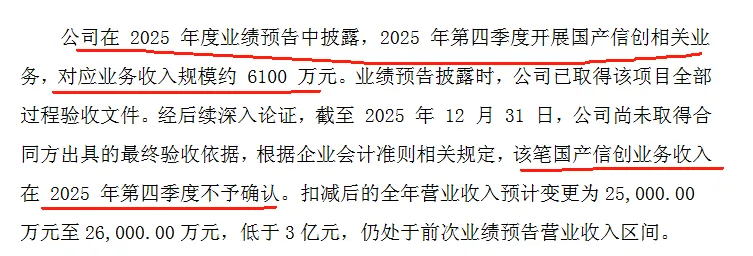 总结:资产减值使得利润变成负的了,信创6100万没有确认收入使得营收低于3亿。26年没有保壳压力。