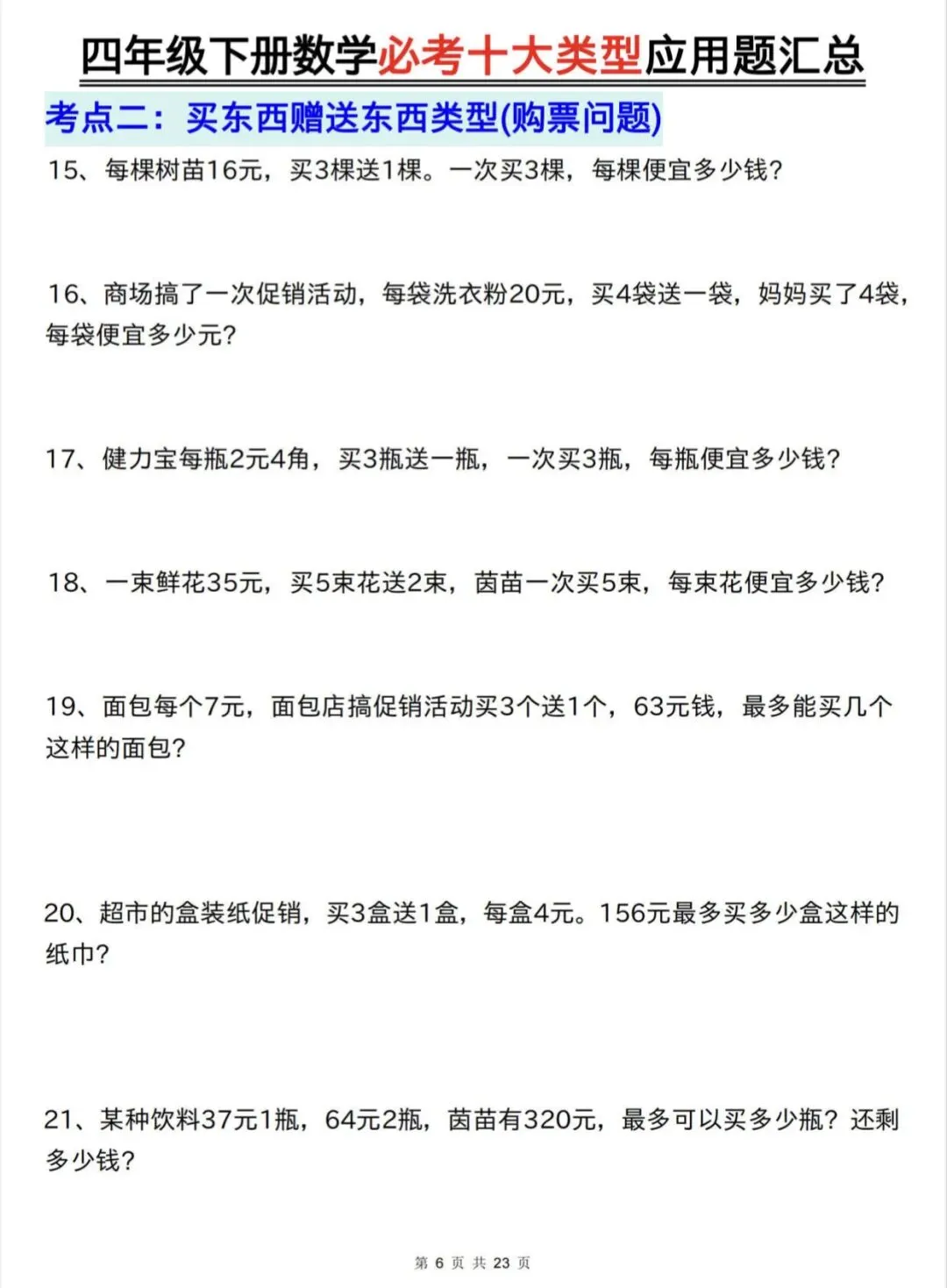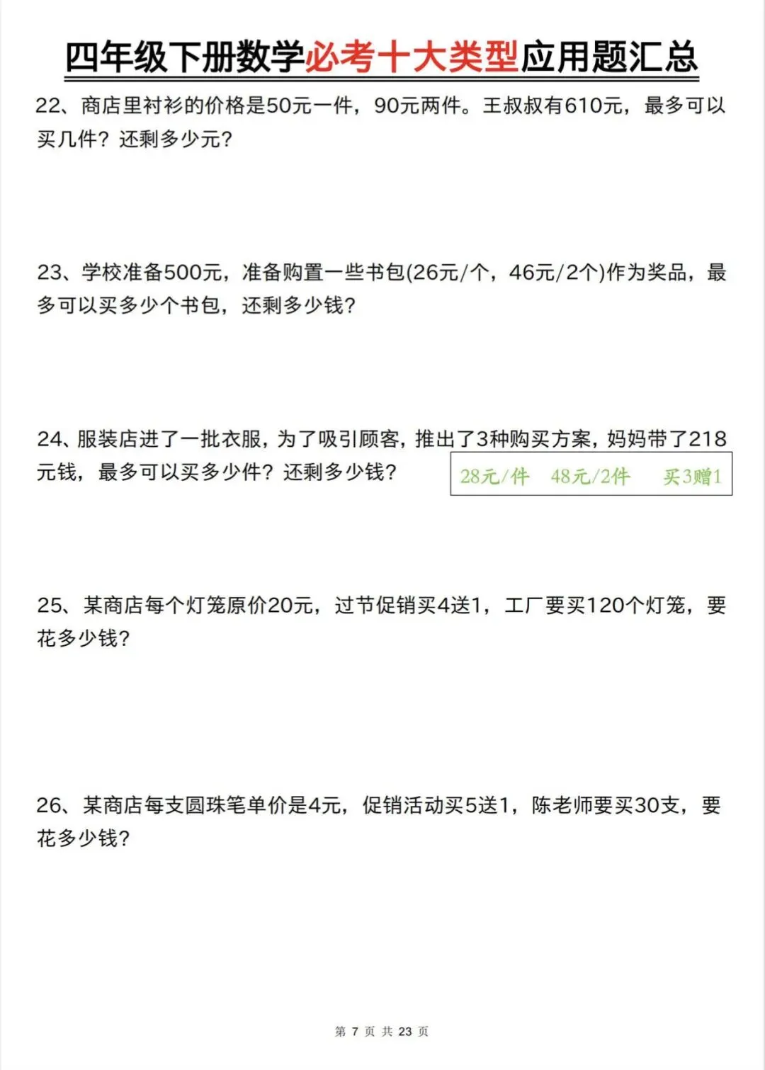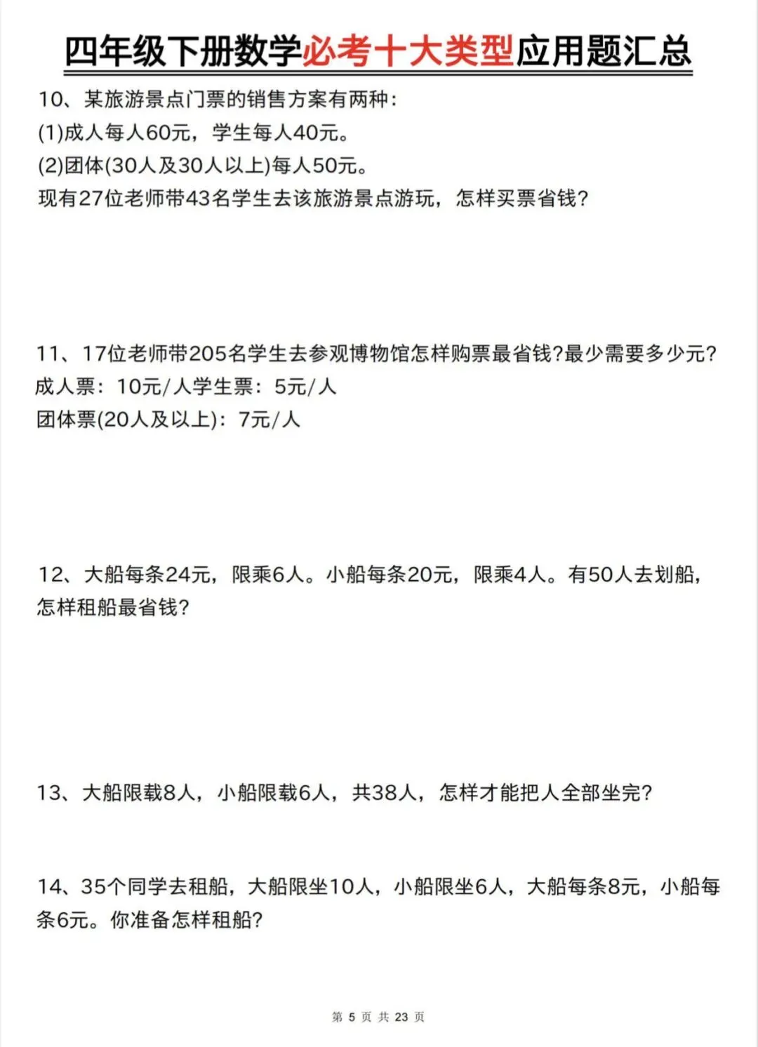 四年级下数学必考十大类型应用题汇总|可打印