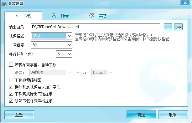 包括设置视频的下载格式、输出目录、是否下载字幕、默认清晰度等等。