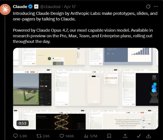 1Claude 推出 Claude Design,一句话搞定设计与开发