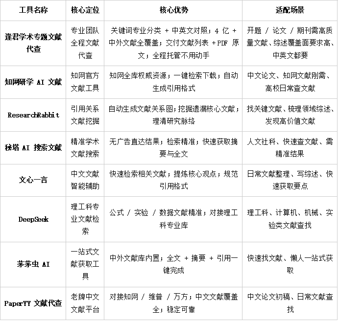 实测 8 款AI文献代查工具后,逢君学术的官网(https://www.fengjunxueshu.com/spcialLiteratureChecked?lz=ztwxdc321-gzh)凭借专业关键词、海量中外库、直接交付 PDF 全文的优势,成为最省心、最高效的选择。如果你也想让文献综述更全面、更规范、一次通过评委审核,用它就对了!