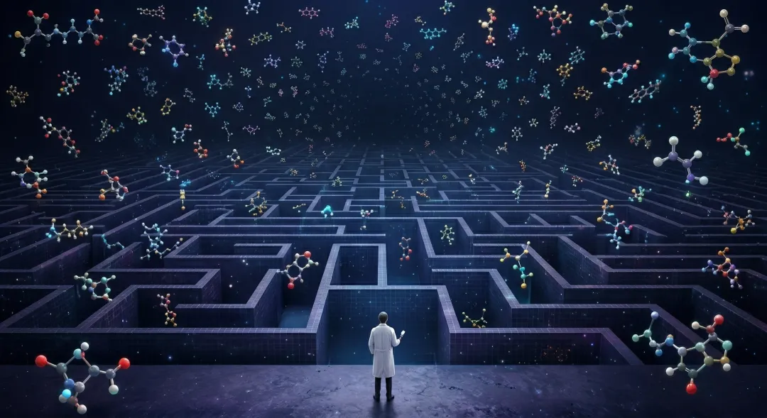 第一,分子空间大到几乎无法穷尽。仅仅由碳、氢、氧、氮等常见元素构成的小分子,理论上组合数量就可以达到10的200次方,这一数字远远超过整个宇宙的原子总数,人类穷尽所有时间与资源,都不可能通过传统实验逐一探索。即便只看具备成药潜力的小分子,数量也高达10的60次方,传统实验方法也根本无法覆盖。