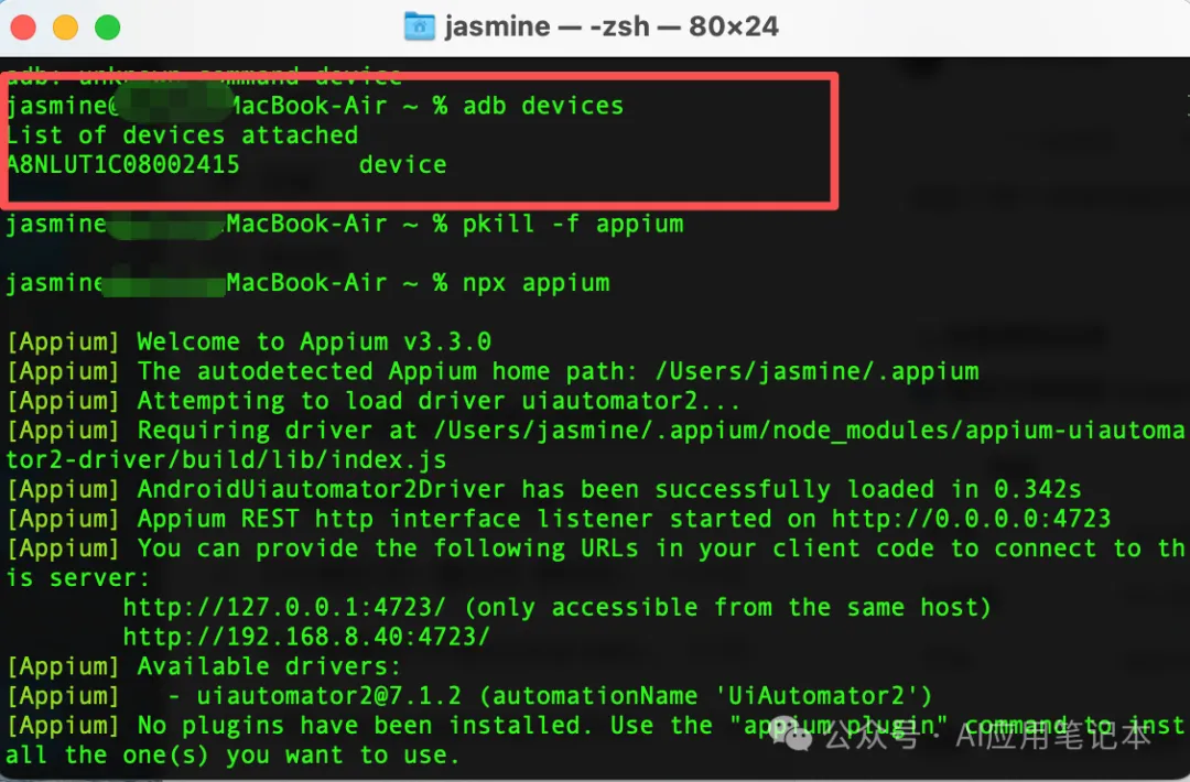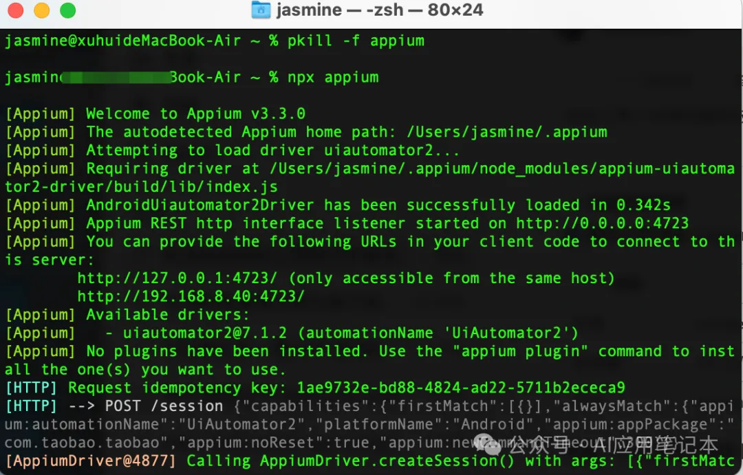 # 全局安装 appiumnpm install -g appium# 安装 UiAutomator2 驱动npx appium driver install uiautomator2# 启动服务(默认 http://127.0.0.1:4723)npx appium