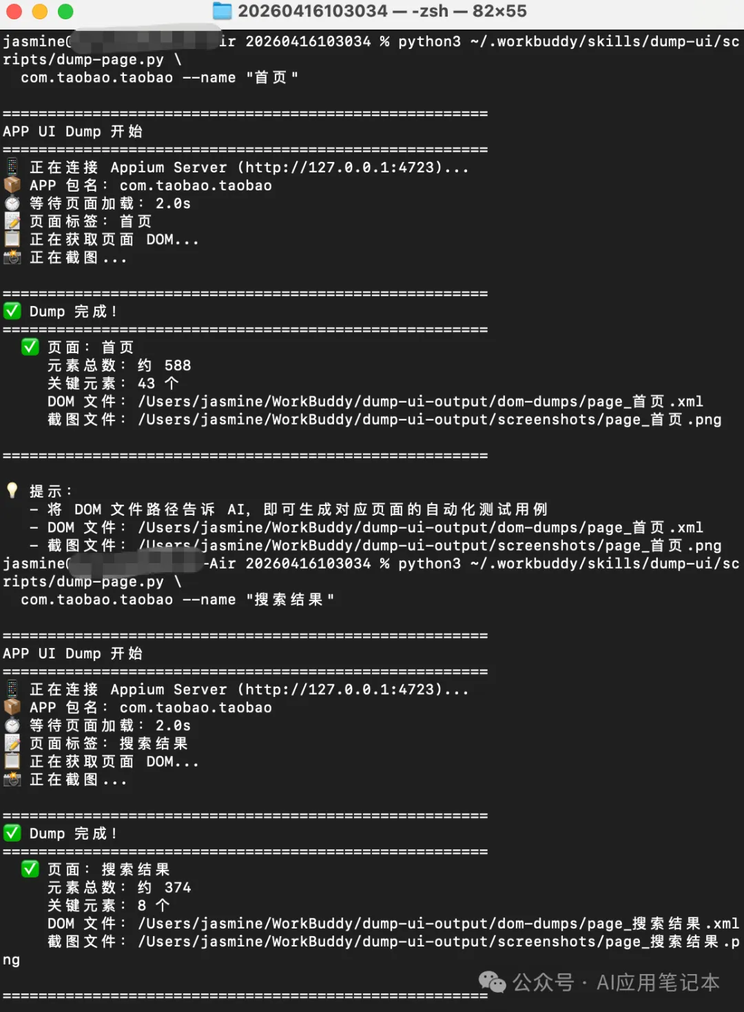 python3 ~/.workbuddy/skills/dump-ui/scripts/dump-page.py \com.taobao.taobao --name "首页"命令执行成功后,会在两个位置生成输出: