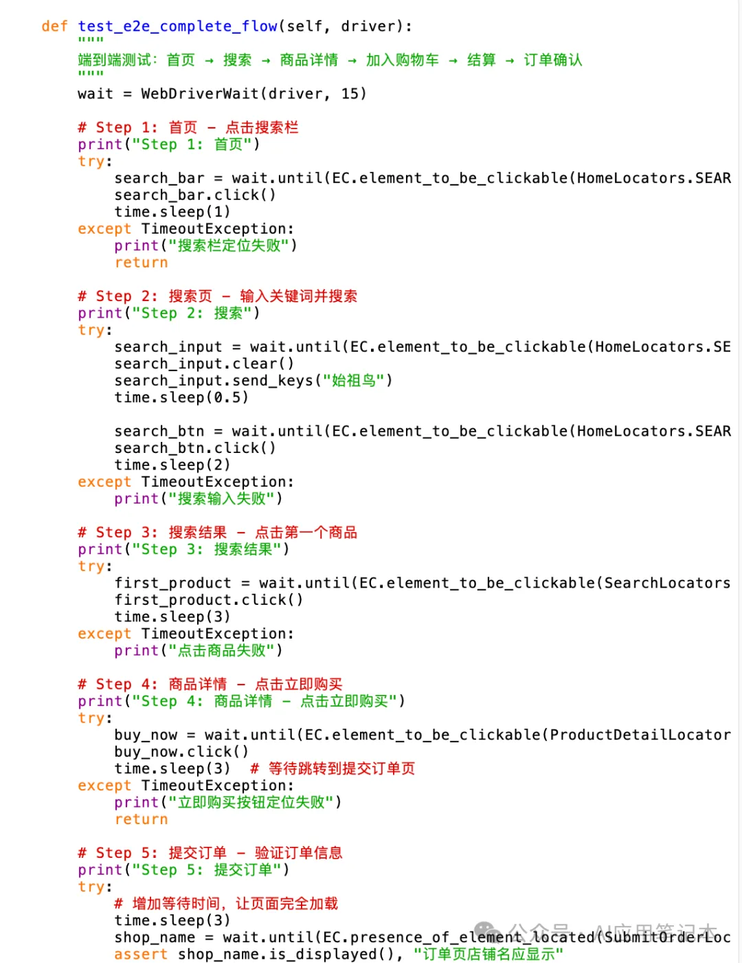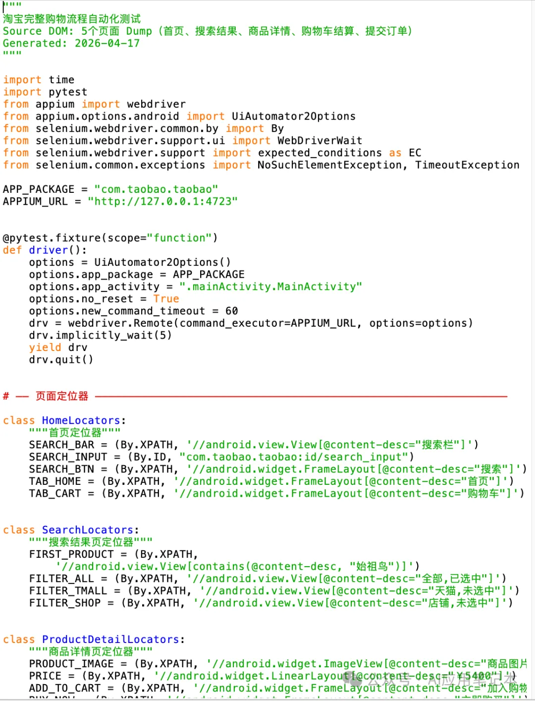 from appium.options import UiAutomator2Options在新版里会报 ImportError,必须换成from appium.options.android import UiAutomator2Options。7.2 端到端用例代码(首页 → 提交订单)
