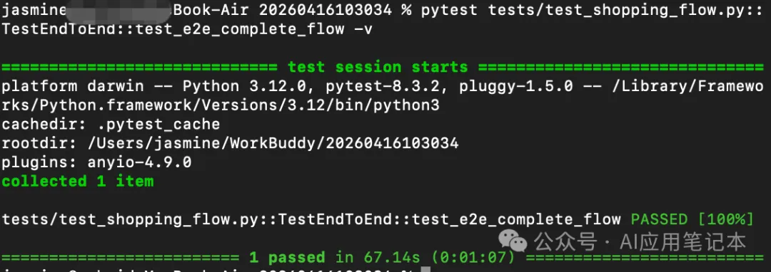 pytest tests/test_shopping_flow.py::TestEndToEnd -v执行结果,用例执行成功: