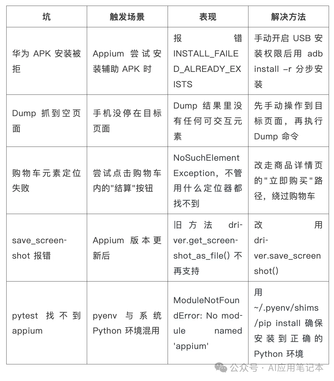 踩过的坑都帮你记录了 华为 APK 安装、Weex 页面识别、Appium 版本兼容性问题,这些问题我在实测时全部遇到了,解决方案直接写在文档里,你不用再踩一遍。