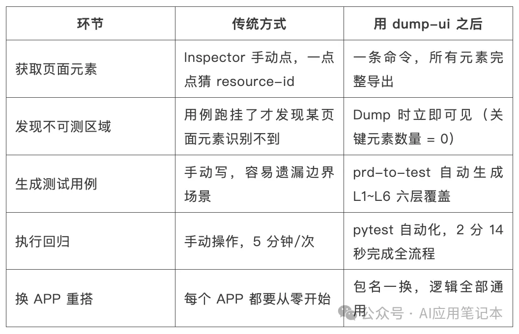 提前发现不可测区域 Dump 结果里”关键可交互元素数量”这列数字会直接告诉你——这个页面 UiAutomator 能不能识别。不需要等用例跑挂了才发现。
